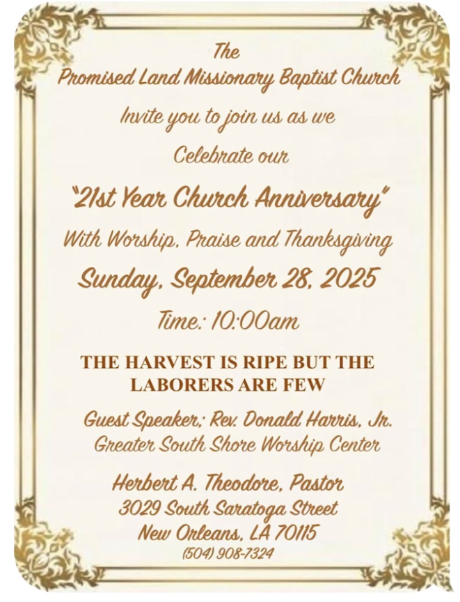 Strengthen your relationship with God and experience the love you have long been searching for by visiting our Baptist church. For over 12 years, PROMISED LAND MISSIONARY BAPTIST CHURCH has been sharing the Good News of our salvation to countless people from the residential, commercial, and industrial sectors in New Orleans, LA and Orleans Parish, LA. Visit us and attend our Bible study sessions, Sunday school programs, and our other praise and worship services. Listen to the Bible teachings and discover your true purpose in life.